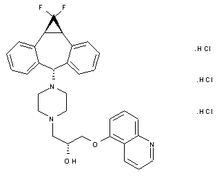 Condensation of dibenzosuberenone (I) with sodium 2-chloro-2,2-difluoroacetate (II) in diglyme at 165 C gives 10,11-(difluoromethano)benzosuberone (III), which is reduced with NaBH4 in THF/methanol to yield the corresponding syn-alcohol (IV). Reaction of alcohol (IV) with hot SOCl2 affords a mixture of the syn- and anti-chloro derivatives (V). This mixture (V) is treated with 1-for-mylpiperazine (VI) in refluxing acetonitrile to provide a mixture of syn- and anti-4-[10,11-(difluoromethano)dibenzosuber-5-yl]piperazine-1-carbaldehyde (VI), which is separated by chromatography. The desired anti-isomer (VII) is then treated with KOH in refluxing ethanol/water to give the piperazine derivative (VIII), which is finally condensed with 5-[2(R),3-epoxypropoxy]quinoline (IX) in refluxing isopranol. 5-[2(R),3-Epoxypropoxy]quinoline (IX) is obtained by reaction of 5-hydroxyquinoline (X) with (R)-glycidyl tosylate (XI) by means of NaH in DMF.