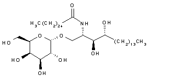 The condensation of 3,4,6-O-tribenzyl-D-galactopyranose (I) with tridecyltriphenylphosphonium bromide (II) by treating first (I) with NaIO4 in aqueous ethanol, and then the resulting product with (II) and butyllithium in THF, gives the partially benzylated unsaturated tetraol (III), which is reduced with H2 over Pd/C in THF to the corresponding saturated compound (IV). The mesylation of (IV) with mesyl chloride and pyridine yields the mesylate (V), which by reaction with sodium azide in DMF is converted into the azido compound (VI). The reduction of (VI) with H2 over Pd/C in THF affords the corresponding amine (VII), which is acylated with hexacosanoic acid (VIII) by means of 2-chloro-1-methylpyridinium iodide (CMPI) in refluxing dichloromethane to give the amide (IX). The debenzylation of (IX) by hydrogenation with H2 over Pd/C in THF/propanol yields the trihydroxylated amide (X), which is selectively triphenylmethylated at the primary alcohol with trityl chloride and dimethylaminopyridine (DMAP) yielding the monotrityl derivative (XI). The subsequent protection of the secondary hydroxy groups with benzoyl chloride and DMAP affords the monotrityl dibenzoate derivative (XII), which is selectively deprotected with p-toluenesulfonic acid in methanol/water yielding the primary alcohol (XIII). The condensation of (XIII) with 2,3,4,6-O-tetrabenzyl-D-galactopyranosyl fluoride (XIV) by means of SnCl2 and AgClO4 in THF gives the fully protected final product (XV), which is first debenzylated by hydrogenation with H2 over Pd in ethyl acetate to the dibenzoate (XVI). Finally, this compound is debenzoylated by hydrolysis with sodium methoxide in methanol/THF.