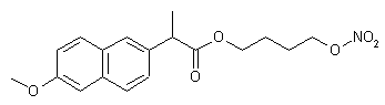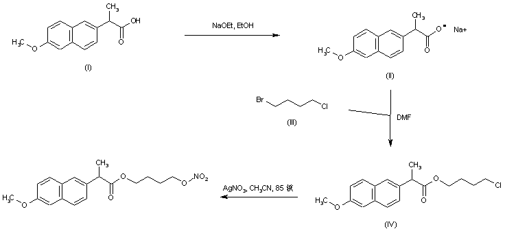 The sodium salt (II), prepared from racemic naproxen (I), was alkylated with 1-bromo-4-chlorobutane (III) in DMF to produce the 4-chlorobutyl ester (IV). Chloride displacement in (IV) by silver nitrate in hot acetonitrile gave rise to the target nitrate ester.