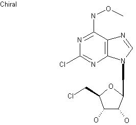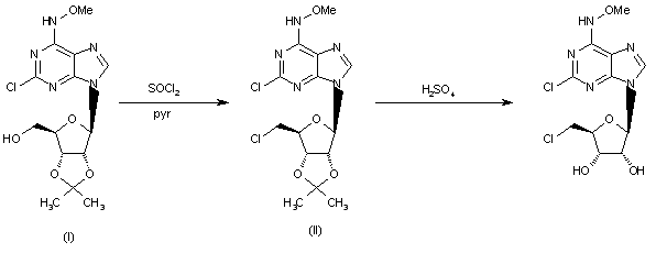 By chlorination of 2-chloro-2',3'-isopropylidene-N-methoxyadenosine (I) with SOCl2 and pyridine gives the 2,5'-dichloro derivative (II), which is deprotected to the target compound with sulfuric acid in methanol.