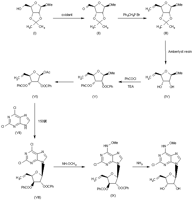 The oxidation of 1-O-mehyl 2,3-isopropylidene-D-ribofuranoside (I) gives the corresponding aldehyde (II), which is condensed with methyltriphenylphosphonium bromide by means of butyllithium in THF yielding methyl 5-deoxy-2,3-isopropylidene-5-methylene-D-ribofuranoside (III). Elimination of the isopropylidene protecting group by passing through an Amberlyst resin (acid form) affords the free ribofuranoside (IV), which is benzoylated with benzoyl chloride and triethylamine in dichloromethane to afford the dibenzoyl derivative (V). The methyl ribofuranoside (V) was converted into the 1-O-acetyl derivative (VI) and condensed with 2,6-dichloro-9H-purine (VII) by heating at 150 C to provide the dichloropurine derivative (VIII), which is treated with O-methylhydroxylamine and triethylamine to afford 2',3'-di-O-benzoyl-2-chloro-5'-deoxy-N-methoxy-5'-methyleneadenosine (IX). Finally, this compound is debenzoylated with ammonia in methanol.