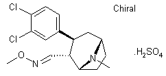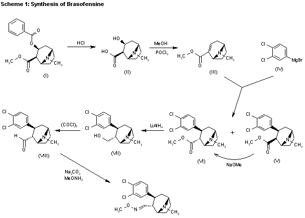 The hydrolysis of (1R,2R,3S,5S)-3-(benzoyloxy)-8-methyl-8-azabicyclo[3.2.1]octane-2-carboxylic acid methyl ester (I) with refluxing 1M HCl gives the corresponding hydroxy acid (II), which is dehydrated with refluxing POCl3 and treated with methanol to the unsaturated methyl ester (III). The reaction of (III) with 3,4-dichlorophenylmagnesium bromide in ether yields a mixture of (1R,2S,3S,5S)- and (1R,2R,3S,5S)-3-(3,4-dichlorophenyl)-8-methyl-8-azabicyclo[3.2.1]octane-2-carboxylic acid methyl esters (V) and (VI), respectively. Enantiomer (V) is isomerized to (VI) by treating the mixture with sodium methoxide in refluxing methanol. The reduction of (VI) with LiAlH4 in ethyl ether gives (1R,2R,3S,5S)-[3-(3,4-dichlorophenyl)-8-methyl-8-azabicyclo[3.2.1]octan-2-yl]methanol (VII), which is oxidized with oxalyl chloride in dichloromethane, affording aldehyde (VIII). Finally, this compound is treated with methoxyammonium chloride and Na2CO3 in methanol, giving brasofensine as an oil. Several salts of brasofensine were obtained by addition of the acid to a solution of brasofensine in ethanol and recrystallization from either water or isopropanol.