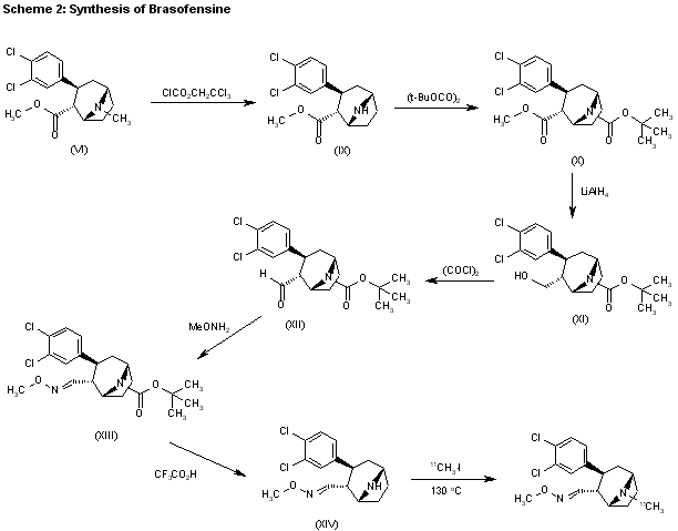 Synthesis of 8-[11C-methyl]-brasofensine: The demethylation of the previously described intermediate (VI) by means of 2,2,2-trichloroethyl chloroformate in refluxing toluene gives the expected ester (IX), which is protected with di-tert-butyl dicarbonate in THF, affording (1R,2R,3S,5S)-8-(tert-butoxycarbonyl)-3-(3,4-dichlorophenyl)-8-azabicyclo[3.2.1]octane-2-carboxylic acid methyl ester (X). The reduction of (X) with LiAlH4 in ethyl ether gives (1R,2R,3S,5S)-8-(tert-butoxycarbonyl)-[3-(3,4-dichlorophenyl)-8-methyl-8-azabicyclo[3.2.1]octan-2-yl]methanol (XI), which is oxidized with oxalyl chloride in dichloromethane, affording the aldehyde (XII). The reaction of (XII) with methoxyammonium chloride and Na2CO3 in methanol gives the O-methyloxime (XIII), which is deprotected with trifluoroacetic acid in dichloromethane, yielding (1R,2R,3S,5S)-3-(3,4-dichlorophenyl)-8-azabicyclo[3.2.1]octane-2-carbadehyde O-methyloxime (XIV). Finally, this compound is methylated with [11C]-methyl iodide in DMSO at 130 C.