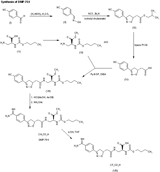 Reaction of 4-cyanobenzaldehyde (I) with hydroxylamine sulfate in methanol gives 4-cyanobenzaldoxime (II). A 1,3-dipolar cycloaddition of (II) with isobutyl vinylacetate using N-chlorosuccinimide provides the racemic isoxazoline derivative (III). Treatment of (III) with lipase PS30 selectively converts the (R)-isomer to an optically pure acid (IV). Coupling of (IV) with methyl N2-(n-butyloxycarbonyl)-L-2,3-diaminopropionate (VI), which is derived from its corresponding commerically available acid (V), gives the intermediate (VII). Treatment of (VII) with HCl in methanol and ethyl acetate followed by ammonium acetate affords DMP 754 as a crystalline product. Saponification of DMP 754 using LiOH provides the corresponding acid (VIII).