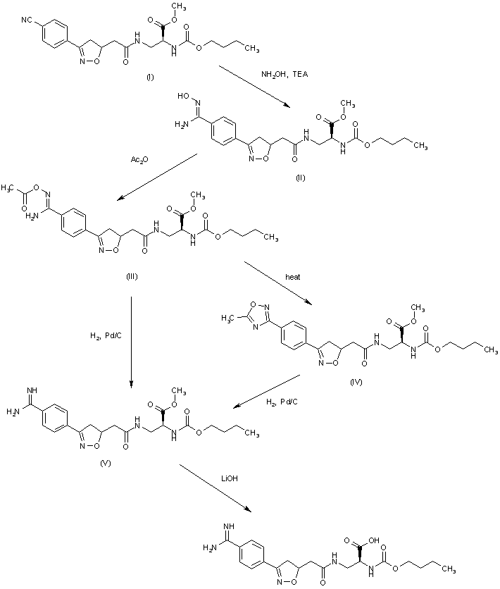 The reaction of N-(butoxycarbonyl)-3-[2-[3-(4-cyanophenyl)-4,5-dihydroisoxazol-5(R)-yl]acetamido]-L-alanine methyl ester (I) (intermediate (VII) in scheme no. 22467601a) with hydroxylamine and TEA in hot methanol gives the N-hydroxyamidine compound (II), which is treated with Ac2O in acetic acid to yield the N-acetoxyamidino compound (III). The cyclization of (III) by means of Ac2O in refluxing acetic aid affords the 1,2,4-oxadiazole derivative (IV), which is reduced with H2 over Pd/C in methanol/HOAc to provide the amidino derivative (V). Alternatively, the direct reduction of N-acetoxyamidino derivative (III) with H2 over Pd/C in acetic acid also gives the amidino derivative (V). Finally, the methyl ester group of compound (V) is hydrolyzed with LiOH in THF to yield the target roxifiban acetate.
