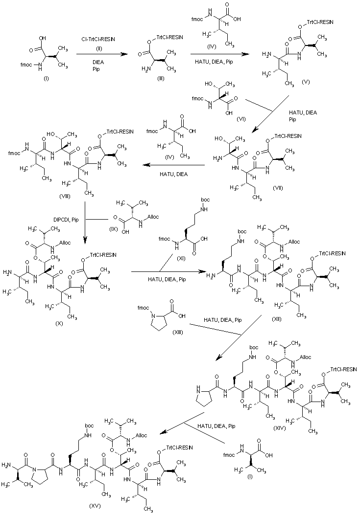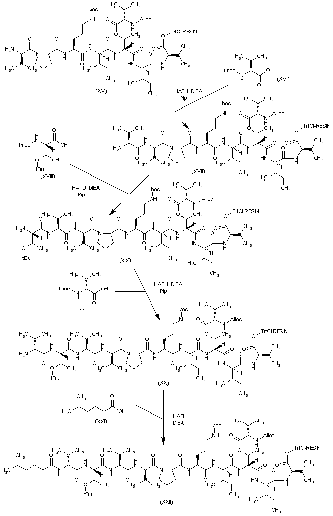Successive deprotection/coupling cycles of peptide resin (XV) with Fmoc-L-Val-OH (XVI), Fmoc-L-Thr(tBu)-OH (XVIII), Fmoc-D-Val-OH (I) and 5-methylhexanoic acid (XXI) give peptide resins (XVII), (XIX), (XX) and (XXII), respectively.