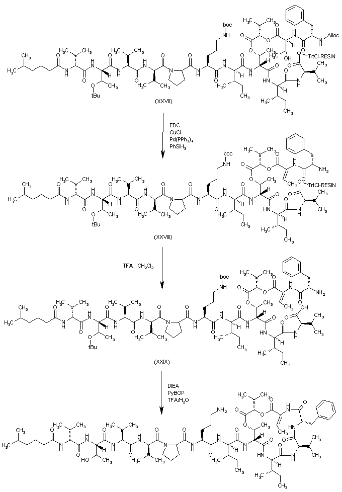 The dehydration of peptide resin (XXVII) by means of EDC and CuCl in DMF/dichloromethane, followed by elimination of the Alloc protecting group with Pd(PPh3)4 and PhSiH3, gives the peptide resin (XXVIII). The cleavage of the protected peptide from the resin was performed with TFA in dichloromethane to yield peptide (XXIX), which is cyclized by means of DIEA and benzotriazol-1-yl-N-oxy-tris(pyrrolidino)phosphonium hexafluorophosphate (PyBOP) and finally deprotected with TFA in water to afford the target kahalalide F.