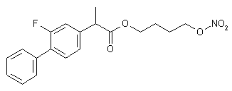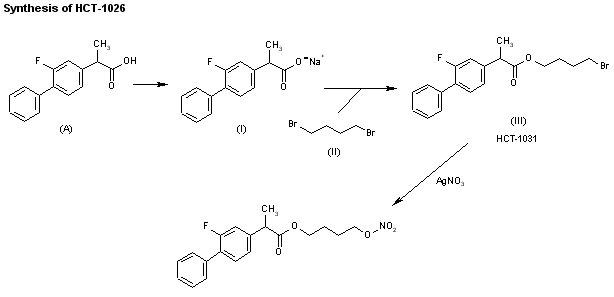 The adopted procedure for the preparation of HCT-1026 consisted in the reaction of flurbiprofen sodium salt (I) and 1,4-dibromobutane (II) in acetonitrile at reflux temperature to obtain HCT-1031 (III), the 4-bromobutyl ester of flurbiprofen. HCT-1031 was then converted into HCT-1026 by reaction with silver nitrate in acetonitrile at reflux temperature. The crude HCT-1026 thus obtained showed 85% HPLC purity with the presence of one major impurity (15%) that was identified as the bis-compound HCT-1028. The crude product was then purified by silica gel column chromatography using toluene as eluent to give a product with >99% HPLC purity in 57% overall yield. After cooling, pure HCT-1026 was obtained as a thick oil.