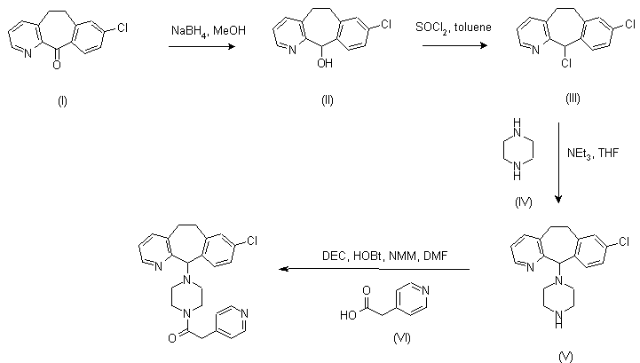 Ketone (I) was reduced with sodium borohydride in methanol to alcohol (II), which was then converted into chloride (III) on treatment with thionyl chloride in cooled toluene. Alkylation of piperazine (IV) with chloride (III) in the presence of triethylamine gave V. Finally, piperazine (V) was condensed with 4-pyridylacetic acid (VI) in the presence of 1-(3-dimethylaminopropyl)-3-ethylcarbodiimide hydrochloride (DEC), 1-hydroxybenzotriazole (HOBt), and N-methylmorpholine in DMF to afford the target amide.