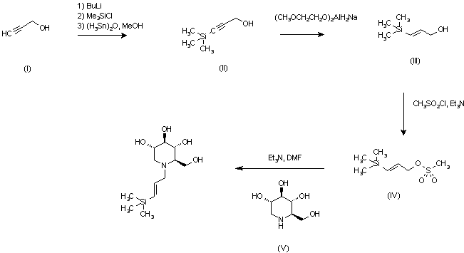 Treatment of propargyl alcohol (I) with two equivalents of butyllithium in THF, followed by chlorotrimethylsilane, and then with methanol and a catalytic amount of distannoxane, gave 3-(trimethylsilyl)-2-propyn-1-ol (II). Partial reduction of acetylenic triple bond with sodium bis(2-methoxyethoxy)aluminum hydride afforded the expected (E)-olefin (III), which on treatment with methanesulfonyl chloride and triethylamine in dichloromethane provided mesylate (IV). Finally, alkylation of 1-deoxynojirimycin (V) with mesylate (IV) in the presence of triethylamine gave the title compound.