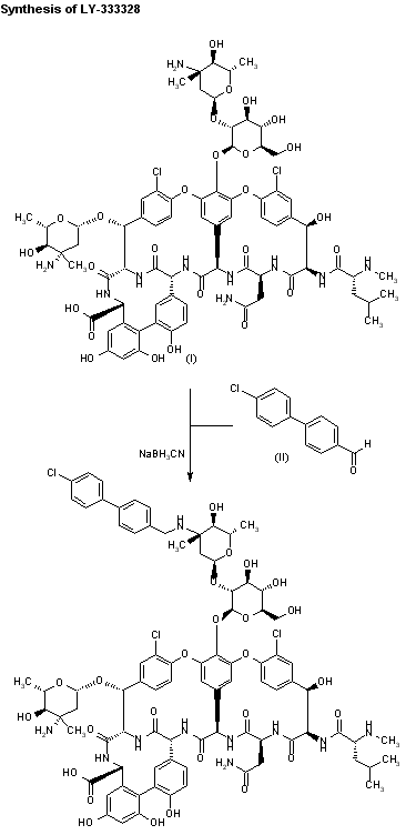 LY-333328 was synthesized by reductocondensation of the glycopeptide antibiotic A82846B (I) with 4'-chlorobiphenyl-4-carboxaldehyde (II) by means of sodium cyanoborohydride in refluxing methanol.