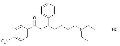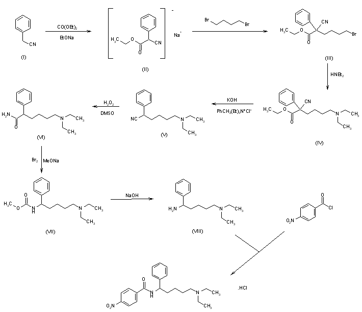 The condensation of 4-nitrophenylacetonitrile (I) with diethyl carbonate by means of sodium ethylate in toluene gave the intermediate arylcyanoacetate sodium salt (II) that was further alkylated with 1,4-dibromobutane (III) to yield the bromobutyl derivative (IV). Subsequent treatment of bromide (IV) with diethylamine provided amine (V). Decarbethoxylation of the cyanoester group of (V) to give (VI) was carried out using aqueous KOH in the presence of benzyltriethylammonium chloride. Partial hydrolysis of the nitrile group of (VI) by means of potassium hydroperoxide in DMSO afforded amide (VII). This was subjected to Hoffman rearrangement by means of Br2 and NaOEt to produce carbamate (VIII), which was subsequently hydrolyzed to amine (IX) with KOH. This was finally coupled with benzoyl chloride to furnish the title benzamide.