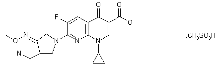 The addition of glycine ethyl ester (I) to 2-propenenitrile (II) by means of KOH in water gives N-(2-cyanoethyl)glycine ethyl ester (III), which is cyclized by means of di-tert-butyl dicarbonate yielding the protected pyrrolidinone (IV). The reduction of (IV) with NaBH4 in ethanol affords the pyrrolidinol (V), which is further reduced with LiAlH4 in THF and protected with di-tert-butyl dicarbonate to give the fully N-protected compound (VI). The oxidation of (VI) with pyridine/SO3 complex yields the pyrrolidinone (VII), which is treated with O-methylhydroxylamine (VIII) to afford the correponding oxime (IX). The deprotection of (IX) with acetyl chloride in cool methanol gives 4-(aminomethyl)pyrrolidin-3-one O-methyloxime (X), which is finally condensed with 7-chloro-1-cyclopropyl-6-fluoro-4-oxo-1,4-dihydro-1,8-naphthyridine-3-carboxylic acid (XI) by means of 1,8-diazabicyclo[5.4.0]undec-7-ene (DBU) in acetonitrile.