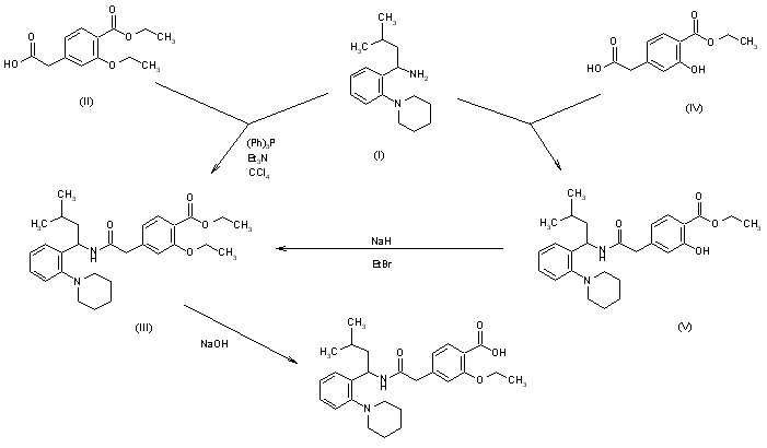 1) The condensation of 3-methyl-1-[2-(1-piperidinyl)phenyl)butylamine (I) with 2-[3-ethoxy-4-(ethoxycarbonyl)phenyl]acetic acid (II) by means of triphenylphosphine, triethylamine and CCl4 gives the corresponding amide-ester (III), which is then hydrolyzed with NaOH in ethanol/water to the racemic repaglinide. 2) The condensation of amine (I) with 2-[4-(ethoxycarbonyl)-3-hydroxyphenyl]acetic acid (IV) by means of triphenylphosphine as before yields the corresponding amide-ester (V), which is then submitted to ethoxylation with NaH and ethyl bromide in DMF to afford the racemic amide-ester (III), already obtained.