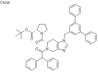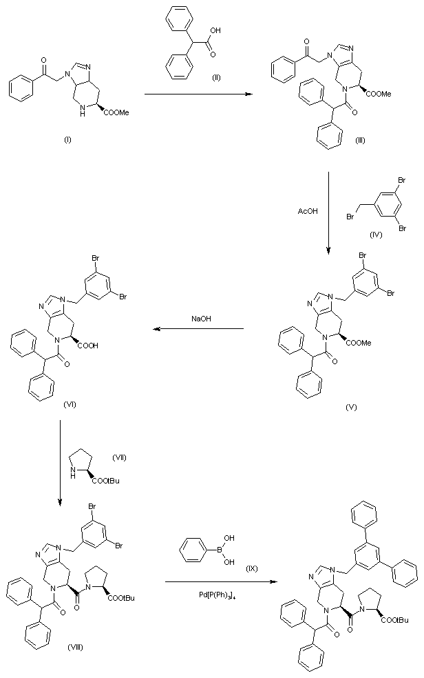 | 合成路线图解说明: The reaction of 3-phenacyl-4,5,6,7-tetrahydro-3H-imidazo[4,5-c]pyridine-6(S)-carboxylic acid methyl ester (I) with 2,2-diphenylacetic acid (II) gives 5-(2,2-diphenylacetyl)-3-phenacyl-4,5,6,7-tetrahydro-3H-imidazo[4,5-c]pyridine-6(S)-carboxylic acid methyl ester (III), which is condensed with 3,5-dibromobenzyl bromide (IV) in acetic acid yielding the corresponding 1-(3,5-dibromobenzyl) derivative (V). The hydrolysis of the ester group of (V) with NaOH affords the expected free acid (VI), which is condensed with L-proline tert-butyl ester (VII) giving the corresponding N-substituted L-proline ester (VIII). Finall this compound is coupled with phenylboronic acid (IX), catalized with palladium tetrakis(triphenylphosphine) complex. |