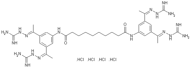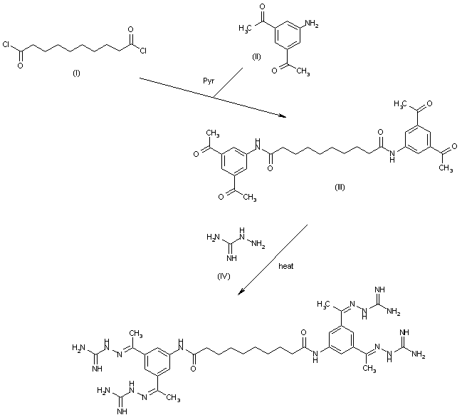 The reaction of decanedioyl dichloride (I) with 3,5-diacetylaniline (II) by means of pyridine in dichloromethane gives the corresponding diamide (III), which is condensed with aminoguanidine (IV) in refluxing aqueous ethanol to afford the target tetrakis amidinohydrazone.