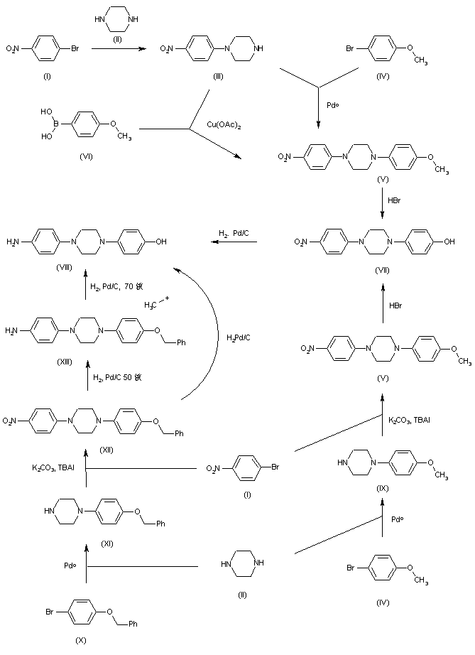 The intermediate 4-[4-(4-aminophenyl)piperazin-1-yl]phenol (VIII) has been obtained by several related ways: 1.- The condensation of 4-bromonitrobenzene (I) with piperazine (II) gives 1-(4-nitrophenyl)piperazine (III), which is condensed with 4-bromoanisole (IV) by means of Pdo to yield 1-(4-methoxyphenyl)-4-(4-nitrophenyl)piperazine (V). Alternatively, (V) can also be obtained by condensation of (III) with 4-methoxyphenylboronic acid (VI) by means of Cu(OAc)2 in DMSO. The demethylation of (V) with HBr yields 4-[4-(4-nitrophenyl)piperazin-1-yl]phenol (VII), which is finally reduced with H2 over Pd/C to afford the target 4-[4-(4-aminophenyl)piperazin-1-yl]phenol (VIII) intermediate (see Synthline, scheme no. 22656202a, intermediate (XIV)). 2.- The condensation of piperazine (II) with 4-bromoanisole (IV) by means of Pdo gives 1-(4-methoxyphenyl)piperazine (IX), which is condensed with 4-bromonitrobenzene (I) by means of K2CO3 and tetrabutylammonium iodide (TBAI) in hot DMSO to yield intermediate 1-(4-methoxyphenyl)-4-(4-nitrophenyl)piperazine (V), already reported. 3.- The condensation of piperazine (II) with 4-(benzyloxy)phenyl bromide (X) by means of Pdo gives 1-(4-benzyloxyphenyl)piperazine (XI), which is condensed with 4-bromonitrobenzene (I) by means of K2CO3 and TBAI in hot DMSO to yield 1-(4-benzyloxyphenyl)-4-(4-nitrophenyl)piperazine (XII). The nitro group of (XII) is reduced by means of H2 (50 psi) over Pd/C in wet THF at 50? C to afford 4-[4-(4-benzyloxyphenyl)piperazin-1-yl]aniline (XIII), which is finally debenzylated with H2 (80 psi) over Pd/C in wet THF at 70? C or other drastic conditions to afford the target 4-[4-(4-aminophenyl)piperazin-1-yl]phenol (VIII) intermediate (see Synthline, scheme no. 22656202a, intermediate (XIV)). Alternatively, 1-(4-benzyloxyphenyl)-4-(4-nitrophenyl)piperazine (XII) can also be reduced directly to the target intermediate (VIII) with H2 over Pd/C under a variety of drastic conditions.