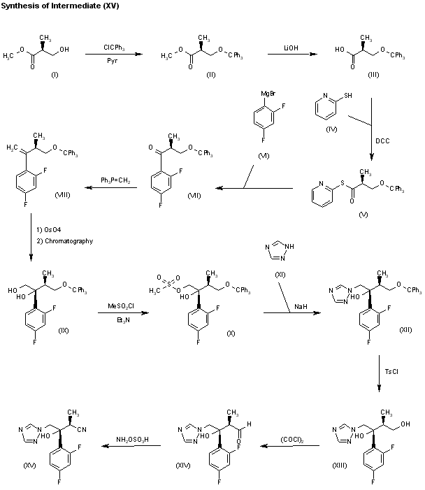 The nitrile (III), a chiral key intermediate of this synthesis, can be obtained by two different synthetic routes as follows: Route-b: The starting material of this route is methyl (S)-3-hydroxy-2-methylpropionate (VIII), which contains one additional carbon between the hydroxyl group and the 2-position carbon of (R)-lactate, the starting material of route-a. The hydroxyl group of (VIII) is protected by triphenylmethyl group. Then, 2,4-difluorophenyl moiety is introduced to give the ketone (X). Direct conversion of the ketone (X) to the oxirane (XIV) by dimethylsulfoxonium methylide, the same condition for compound (IV) in route-a, does not proceed. The oxirane (XIV) having desired stereochemistry is obtained via oxidation reaction. The ketone (X) is converted to the exomethylene (XI) by Wittig reaction. The stereoselective oxidation of (XI) is achieved by means of osmium tetroxide in the presence of 4-methylmorpholine N-oxide to give the diol (XII) in 58% yield after separation of its epimer by column chromatography. After methanesulfonylation of the primary alcohol of (XII), a triazole moiety is introduced and the triphenylmethyl group is deprotected. Then, the primary hydroxyl group of (XVI) is oxidized under Swern oxidation condition to give the aldehyde (XVII), which is converted to the chiral nitrile intermediate (III) by means of heating with hydroxylamine-O-sulfonic acid.