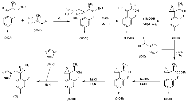 The known chiral epoxide (IX) can be synthesized by several different ways shown in the following: 1) 2(S)-Acetoxypropionic acid (XII) is treated first with oxalyl chloride in DMF/CH2Cl2, and then the resultant acyl chloride is submitted to a Friedel-Crafts reaction with 1,3-difluorobenzene (XIII) by means of AlCl3 to provide a 1:1 mixture of a(S)-acetoxypropiophenone (XIV) and a(S)-hydroxy-propiophenone (XV). This mixture is treated with H2SO4 in MeOH to give the pure alcohol (XV). Tosylation of alcohol (XV) with p-toluenesulfonyl chloride in pyridine furnishes tosylate (XVI), which is converted into a(R)-hydroxypropiophenone (XVII) by an SN2 displacement reaction with LiOH in DMF/H2O. Reaction of the hydroxy group of (XVII) with 2,3-dihydropyran (XVIII) and pyridi-nium p-toluenesulfonate (PPTS) in CH2Cl2 gives the protected compound (XIX), which is converted into the silyl alcohol (XXI) by a Grignard reaction with (chloro-methyl)dimethylisopropoxysilane (XX) in the presence of Mg and a small amount of MeI. Oxidative desilylation of (XXI) by means of NaHCO3 and H2O2 in THF/MeOH, followed by hydrolysis with TsOH in MeOH, affords the triol (XXII), which is then mesylated with methanesulfonyl chloride in pyridine to provide the dimesylate (XXIII). Finally, nucleofilic substitution of one mesylate group of (XXIII) with 1H-1,2,4-triazole (XXIV) by means of NaH in DMF with concomitant epoxide formation affords the desired intermediate (IX).
