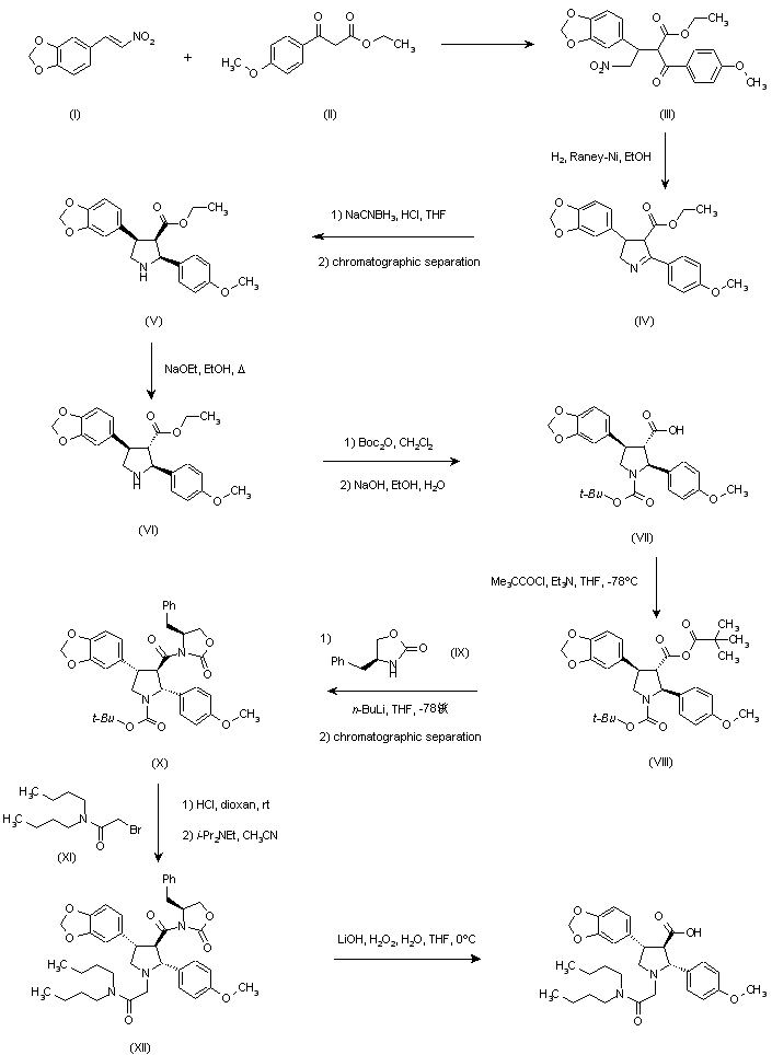 The Michael reaction between 3,4-(methylenedioxy)-beta-nitrostyrene (I) and ethyl (4-methoxybenzoyl)acetate (II) in the presence of DBU gave adduct (III) as a mixture of isomers. Hydrogenation of this nitro ketone over Raney-Ni afforded, after spontaneous cyclization of the resulting amino ketone, the pyrroline (IV). Further reduction of the imine with NaBH3CN yielded a mixture of three pyrrolidine isomers. The desired trans-trans isomer (VI) could not be separated from the cis-trans isomer by column chromatography. However, the pure cis-cis compound (V) was isomerized to (VI) with NaOEt in refluxing EtOH. The protection of the amine as the tert-butyl carbamate with Boc2O, and saponification of the ester function provided the racemic acid (VII). Resolution of (VII) was achieved by conversion to the mixed anhydride (VIII) with pivaloyl chloride, followed by condensation with the lithium salt of (S)-4-benzyl-2-oxazolidinone (IX), and chromatographic separation of the resulting diastereomeric imides. Alternatively, racemic (VII) could be resolved by crystallization of its salt with (R)-a-methylbenzylamine. Removal of the Boc group from the appropriate isomer (X) with HCl in dioxan, followed by alkylation with N,N-dibutylbromoacetamide (XI) in the presence of i-Pr2NEt furnished the pyrrolidinylacetamide (XII). Finally, hydrolysis of the imide with lithium hydroperoxide provided the target acid.