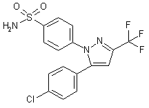Claisen condensation of 4'-chloroacetophenone (I) with ethyl trifluoroacetate in the presence of NaOMe provided diketone (II). Subsequent reaction of (II) with 4-sulfamoylphenylhydrazine (III) provided the title 1,5-diaryl pyrazole along with minor amounts of the 1,3-diaryl regioisomer, which was removed by recrystallization from EtOAc and isooctane.