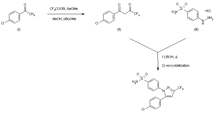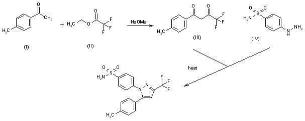 The condensation of 4-methylacetophenone (I) with ethyl trifluoroacetate (II) by means of NaOMe in refluxing methanol gives 4,4,4-trifluoro-1-(4-methylphenyl)butane-1,3-dione, which is cyclized with 4-hydrazinophenylsulfonamide (III) in refluxing ethanol.