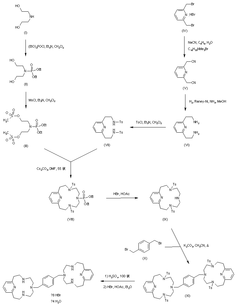 Protection of the amino group of diethanolamine (I) with diethyl chlorophosphate in the presence of triethylamine gave N-(diethoxyphosphoryl)ethanolamine (II). Further treatment of (II) with methanesulfonyl chloride yielded the corresponding bis(mesylate) (III). Reaction of 2,6-bis(bromomethyl) pyridine (IV) with NaCN in the presence of cetyl trimethylammonium bromide under phase-transfer conditions produced dinitrile (V), which was hydrogenated over Raney Nickel to afford diamine (VI). Subsequent condensation of (VI) with p-toluenesulfonyl chloride gave bis(sulfonamide) (VII). Cyclization of bis(mesylate) (III) with bis(sulfonamide) (VII) in the presence of Cs2CO3 gave rise to macrocycle (VIII). Selective deprotection of the diethoxyphosphoryl group by means of HBr in AcOH gave (IX). This was dimerized with alpha,alpha'-dibromo-p-xylene (X) in the presence of K2CO3 in refluxing acetonitrile to give the tosyl-protected dimer (XI). Deprotection of the tosyl groups of (XI) was achieved by reductive treatment with sodium amalgam. The title compound was then isolated after conversion to the octahydrobromide tetrahydrate salt.