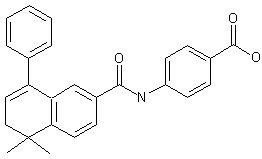 The reaction of 7-amino-4,4-dimethyl-1,2,3,4-tetrahydronaphthalen-1-one (I) with NaNO2 and BF4H in water gives the corresponding diazo compound (II), which is treated with H2SO4 in refluxing water yielding 7-hydroxy-4,4-dimethyl-1,2,3,4-tetrahydronaphthalen-1-one (III). The reaction of (III) with trifluoromethanesulfonic anhydride in pyridine affords the expected sulfonate (IV), which is carboxylated with CO, PdAc2 and 1,3-bis(diphenylphosphino)propane in methanol/DMSO yielding 5,5-dimethyl-8-oxo-5,6,7,8-tetrahydronaphthalene-2-carboxylic acid methyl ester (V). The Grignard condensation of (V) with phenylmagnesium bromide (VI) in THF affords the corresponding addition product (VII), which is dehydrated with p-toluenesulfonic acid in hot toluene affording the dihydronaphtoic ester (VIII). The hydrolysis of (VIII) with NaOH in ethanol gives the corresponding free acid (IX), which is treated with SOCl2 and DMF yielding the expected acyl chloride (X). The condensation of (X) with methyl 4-aminobenzoate (XI) in pyridine affords the expected amide (XII), which is finally hydrolyzed to the target compound with NaOH in ethanol/water.