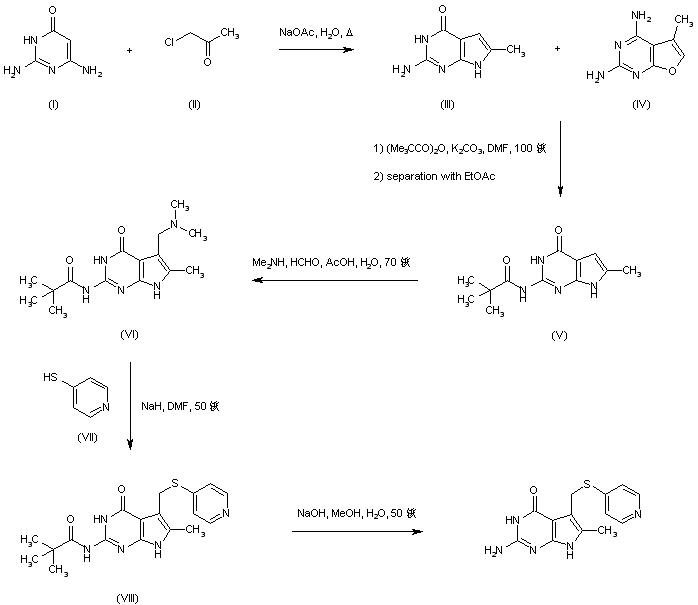 Condensation of 2,6-diamino-4-hydroxypyrimidine (I) with chloroacetone (II) produced a mixture of pyrrolopyrimidine (III) and furopyrimidine (IV). After treatment of this mixture with pivalic anhydride, the insoluble pivaloyl amide of pyrrolopyrimidine (V) was separated from the soluble dipivaloyl furopyrimidine with boiling EtOAc. Subsequent Mannich reaction of (V) with dimethylamine and formaldehyde afforded the (dimethylamino)methyl derivative (VI). The dimethylamino group of (VI) was then displaced with 4-mercaptopyridine (VII) to give thioether (VIII). Finally, the pivaloyl amide group of (VIII) was hydrolyzed with NaOH to yield the target compound.