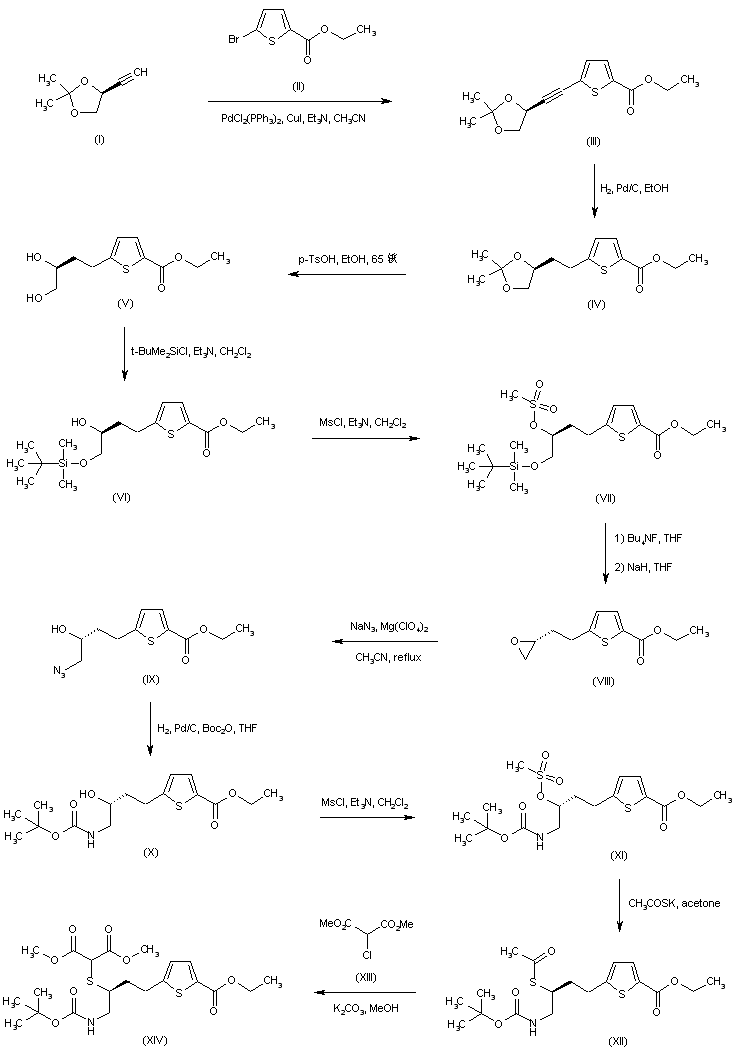 Palladium-catalyzed coupling between (S)-4-ethynyl-2,2-dimethyl[1,3]dioxolane (I) and ethyl 5-bromothiophene-2-carboxylate (II) afforded the acetylene adduct (III), which was further hydrogenated to (IV) in the presence of Pd/C. Acid hydrolysis of the acetonide function of (IV) gave diol (V). In order to invert the configuration of the chiral center of (V), its primary hydroxyl group was protected as the silyl ether (VI) and the secondary alcohol was subsequently converted to mesylate (VII). After desilylation of (VII) by means of tetrabutylammonium fluoride, the resultant mesylate alcohol was cyclized to epoxide (VIII) upon treatment with NaH in THF. Epoxide ring opening in (VIII) with NaN3 furnished azido alcohol (IX). Then, azide reduction in the presence of Boc2O gave rise to the Boc-protected amine (X). Introduction of a sulfur atom was accomplished by conversion of alcohol (X) to mesylate (XI), followed by displacement with potassium thioacetate to yield (XII). Concomitant thioacetate ester (XII) hydrolysis and alkylation of the intermediate thiol with chloromalonate (XIII) provided the mercaptomalonate (XIV).