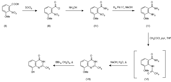 In an alternative procedure, 3-methoxy-2-nitrobenzoic acid (II) was treated with SOCl2 in the presence of DMF in THF, and the resulting acid chloride (III) was converted to amide (IV) with aqueous ammonia. Catalytic hydrogenation of (IV) over Pd/C produced aniline (V), which was then acetylated with AcCl and pyridine. The crude acetylamino compound (VI) was cyclized by treatment with aqueous NaOH to yield the quinazolinone (VII). Finally, demethylation of the methoxy group of (VII) with BBr3 provided the required 8-hydroxyquinazolinone.