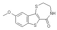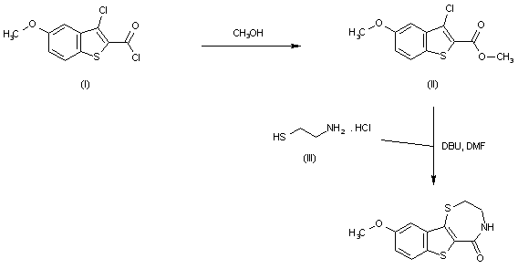 Methyl 3-chloro-5-methoxybenzo[b]thiophene-2-carboxylate (II) was prepared from the known acid chloride (I) by treatment with methanol. Cyclization of the chloro ester (II) with cysteamine hydrochloride (III) in the presence of DBU afforded the target benzothienothiazepinone.