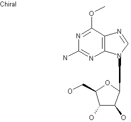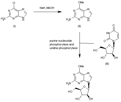 The reaction of 6-chloropurine-2-amine (I) with methanol and NaH gives 6-O-methylguanine (II), which is mixed with uracil arabinoside (III), purine nucleoside phosphorylase and uridine phosphorylase and submitted to incubation in a potassium phosphate solution at 37 C. After 26 days of incubation, the target compound is isolated.