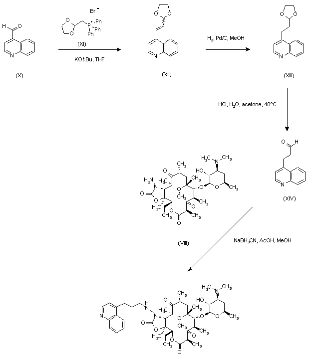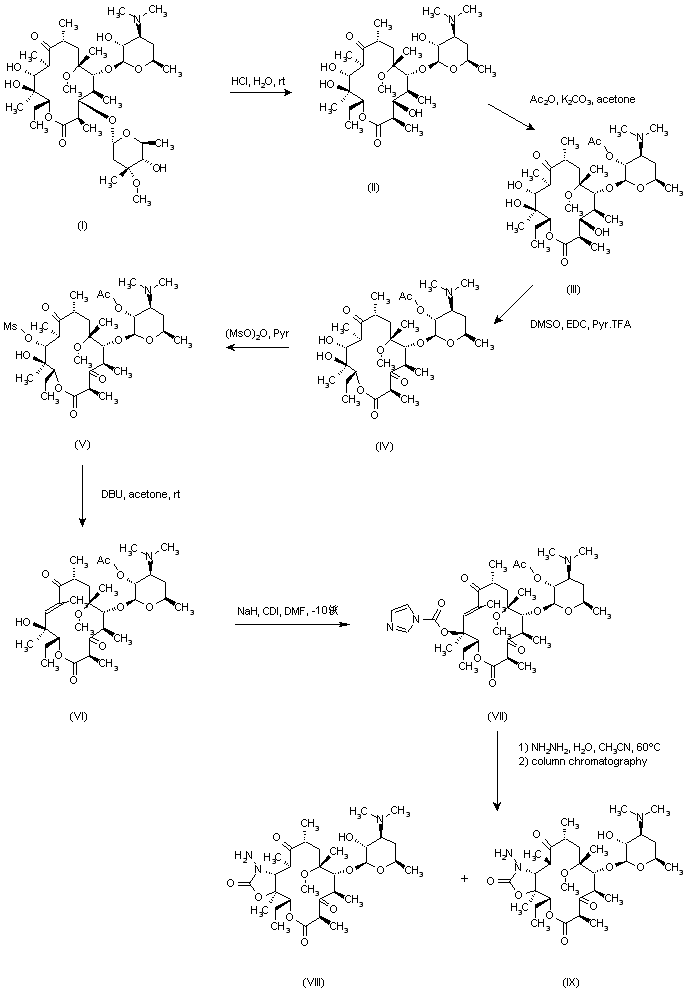 Selective hydrolysis of the cladinose moiety of 6-O-methylerythromycin (I) with aqueous HCl gave (II), which was selectively acetylated at 2'-OH to provide acetate (III). Pfitzner-Moffat oxidation with DMSO, EDC, and pyridinum trifluoroacetate yielded 3-oxo compound (IV). Then, reaction with methanesulfonic anhydride in pyridine gave 11-O-mesylate (V), which on treatment with DBU in acetone produced the elimination product (VI). Subsequent condensation with carbonyldiimidazole in the presence of NaH afforded imidazole-carboxylate (VII). Then, reaction with hydrazine in aqueous acetonitrile provided a mixture of epimeric oxazolidinones (VIII) and (IX), which were separated by column chromatography.