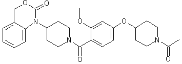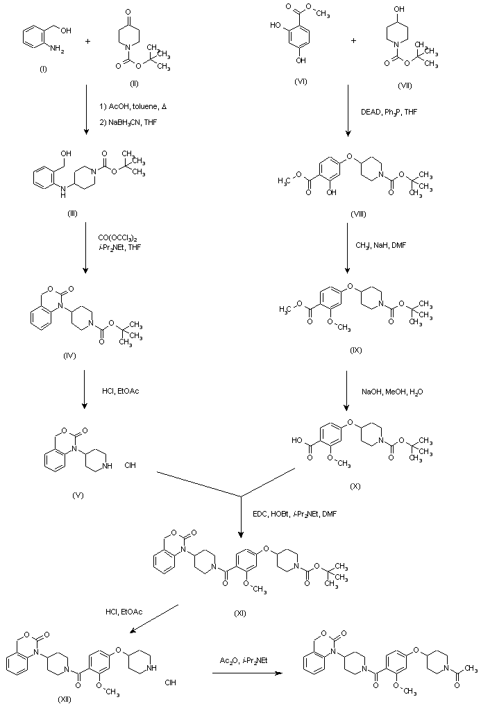 Condensation of 2-(hydroxymethyl)aniline (I) with N-Boc-4-piperidone (II), followed by reduction with NaBH3CN provided anilinopiperidine (III). Cyclization of aminoalcohol (III) with triphosgene gave benzoxazinone (IV), which was deprotected by acidic treatment to yield piperidinylbenzoxazinone (V). Methyl 2,4-dihydroxybenzoate (VI) was selectively alkylated on the 4-position by coupling with N-Boc-4-piperidinol (VII) under Mitsunobu conditions to give ether (VIII). Then, the remaining 2-OH group was methylated with MeI and NaH to give (IX), which was saponified to provide the benzoic acid derivative (X). Coupling of amine (V) and acid (X) using EDC and HOBt produced amide (XI). Then, removal of the tert-butoxycarbonyl group by acid treatment, followed by acetylation of the resulting piperidine (XII) with Ac2O, furnished the target compound.
