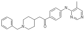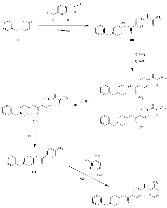 The condensation of 1-benzylpiperidin-4-one (I) with 4-acetamidoacetophenone (II) by means of lithium diisopropylamide in HMPA/THF gives the piperidinol (III), which is dehydrated by reaction first with SOCl2 and then with NaOH yielding a mixture of compounds (IV) and (V) with exo and endo double bonds. This mixture is hydrogenated with H2 over PtO2 in ethanol/toluene to afford the saturated piperidine derivative (VI), which is treated with HCl in refluxing ethanol to cleave the acetamido substituent giving (VII) with a free amino group. Finally, this compound is condensed with 4-chloro-5-methylpyrimidine (VIII) by means of HCl in refluxing ethanol/CHCl3.