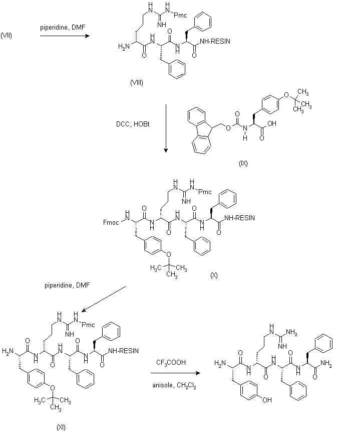 Fmoc-protected phenylalanine (I) is attached to Rink resin by means of DCC and HOBt coupling, to give the amino acid-resin complex (II). Then, N-Fmoc protecting group is removed with piperidine in DMF to afford (III). This is submitted to further sequential amino acid coupling and deprotection cycles with Fmoc-phenylalanine (I) and alpha-Fmoc-omega-pmc-D-arginine (VI) to yield in turn resins (V) and (VII), respectively.