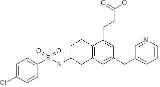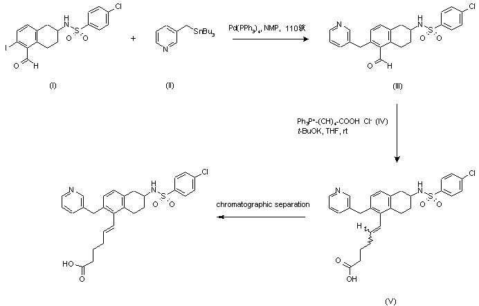 2-Iodo-6-(4-chlorophenylsulfonyl)amino-5,6,7,8-tetrahydro-naphthyl-1-carbaldehyde (I) was coupled with 3-(tributylstannyl-methyl)pyridine (II) in the presence of Pd(PPh3)4 in N-methylpyrrolidine (NMP) at 110 C to afford the pyridinylmethyl derivative (III). Subsequent coupling of (VI) with (4-carboxybutyl)triphenylphosphonium chloride (IV) in the presence of potassium tert-butoxide in THF at low temperature provided a mixture of E and Z hexenoic acids (V), from which the target (E) isomer was isolated by column chromatography.