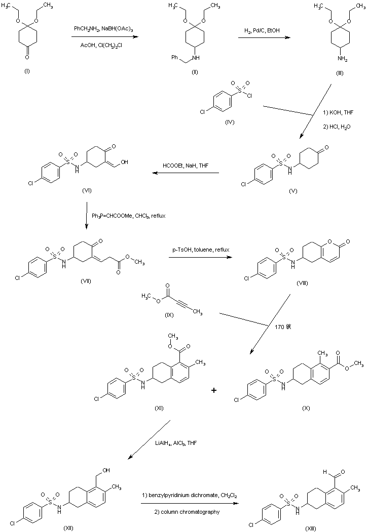Reductive amination of 4,4-diethoxycyclohexanone (I) with benzylamine in the presence of sodium triacetoxyborohydride provided amino ketal (II). Subsequent benzyl group hydrogenolysis in (II) yielded the primary amine (III), which was acylated by 4-chlorobenzenesulfonyl chloride (IV) affording sulfonamide (V). Claisen condensation of ketone (V) with ethyl formate furnished the hydroxymethylene ketone (VI). This was subjected to a Wittig reaction with (methoxycarbonylmethylene)triphenylphosphorane to produce ester (VII). Intramolecular cyclization of (VII) under acidic conditions gave rise to the benzopyranone (VIII). Diels-Alder cycloaddition between methyl butynoate (IX) and benzopyranone (VIII) led to a mixture of two regioisomeric tetrahydronaphthalenes (X) and (XI). Reduction of this mixture of esters by means of LiAlH4 yielded the desired alcohol (XII) along with its regioisomer, which were further oxidized to the corresponding aldehydes employing 4-benzylpyridinium dichromate. Separation of the resultant mixture by column chromatography furnished the desired aldehyde (XIII).