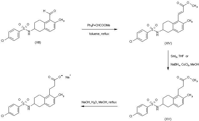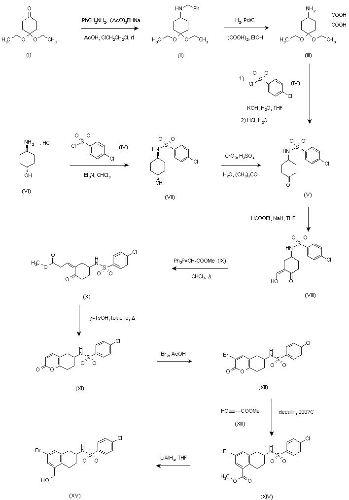 The intermediate 4-(4-chlorophenylsulfonyl)aminocyclohexanone (V) was prepared by two synthetic ways. Reductive condensation of 4,4-diethoxycyclohexanone (I) with benzylamine in the presence of sodium triacetoxyborohydride and AcOH provided the benzylcyclohexylamine (II). Further hydrogenolysis of the N-benzyl group of (II) in the presence of Pd/C and oxalic acid yielded cyclohexylamine (III) as the oxalate salt. Sulfonamide (V) was then obtained by condensation with 4-chlorophenylsulfonyl chloride (IV), followed by hydrolysis of the diethyl acetal with aqueous HCl. lternatively, treatment of trans-4-aminocyclohexanol hydrochloride (VI) with sulfonyl chloride (IV) in the presence of Et3N provided the sulfonamide (VII), which was subsequently oxidized with chromic anhydride and H2SO4 to the target ketone (V). Condensation of this intermediate (V) with ethyl formate in the presence of NaH produced the hydroxymethylene cyclohexanone (VIII), which was submitted to a Wittig reaction with phosphorane (IX) to give the cyclohexylidenpropanoic ester (X). Cyclization of this compound using anhydrous p-toluenesulfonic acid in refluxing toluene furnished pyranone (XI), which by subsequent bromination in acetic acid yielded the 3-bromopyranone (XII). The key tetrahydronaphthalene system (XIV) was then obtained by Diels-Alder reaction with methyl propiolate (XIII) with concomitant decarboxylation at 200 C. Finally, the ester function of (XIV) was reduced to alcohol (XV) with LiAlH4.