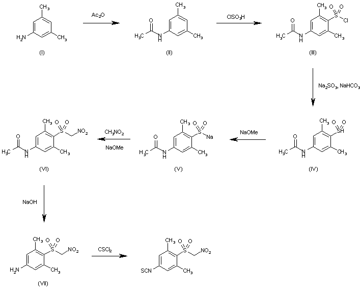 The acetylation of 3,5-dimethylaniline (I) with acetic anhydride gives the acetamide (II), which is treated with chlorosulfonic acid yielding the benzenesulfonyl chloride (III). The reduction of (III) with Na2SO3 and NaHCO3 in water affords the sulfinic acid (IV), which by reaction with sodium methoxide in methanol gives the corresponding sodium salt (V). The reaction of (V) with nitromethane and sodium methoxide yields the sulfonylnitromethane (VI), which is deacetylated with hot 2N NaOH affording 3,5-dimethyl-4-(nitromethylsulfonyl)aniline (VII). Finally, this compound is treated with thiophosgene in acetone to provide the target isothiocyanate.