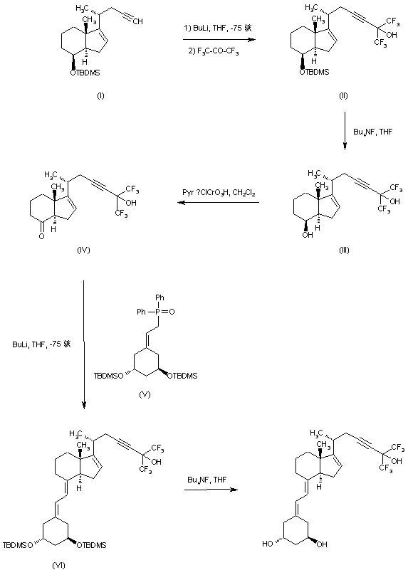 Condensation of the lithium anion of alkyne (I) with hexafluoroacetone provided the tertiary alcohol (II). Subsequent deprotection of the silyl ether of (II) with tetrabutylammonium fluoride yielded alcohol (III), which was oxidized to ketone (IV) by means of pyridinium chlorochromate. Wittig condensation of (IV) with the ylide resulting from phosphine (V) and BuLi produced diene (VI). Finally, both silyl ethers of (VI) were cleaved with tetrabutylammonium fluoride to furnish the title compound.