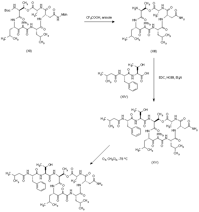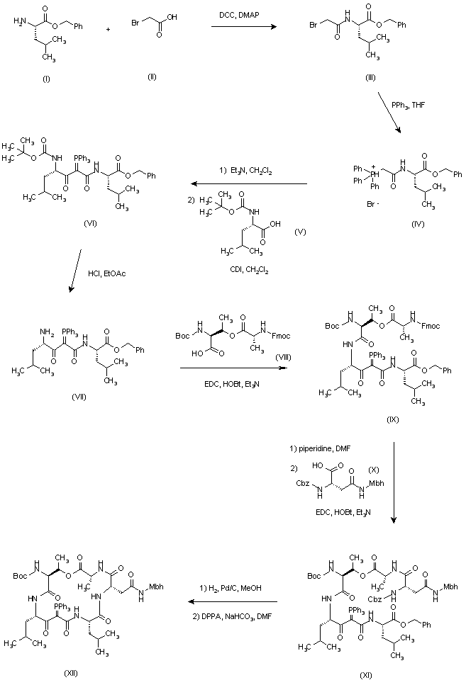 Acylation of L-leucine benzyl ester (I) with bromoacetic acid (II) in the presence of DCC and DMAP gave bromoacetamide (III), which upon reaction with triphenyl phosphine was converted to phosphonium salt (IV). After treatment of (IV) with Et3N, the resulting ylide was condensed with N-Boc-L-leucine (V) to yield the acyl- phosphonate (VI). Acid deprotection of the N-Boc group of (VI) provided amine (VII), which was condensed with the depsipeptide (VIII) using EDC and HOBt yielding (IX). Removal of the N-Fmoc group from tetrapeptide (IX) was effected by treatment with piperidine in DMF, and the resulting amino compound was further condensed with protected L-asparagine (X) to furnish peptide (XI). After hydrogenolytic removal of the benzyl and carbobenzoxy groups of (XI), treatment with diphenyl phosphoryl azide and NaHCO3 produced the cyclic depsipeptide (XII).
