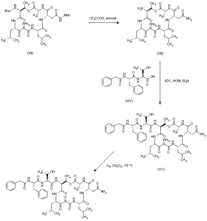 The tert-butoxycarbonyl and 4,4'-dimethoxybenzhydryl groups of (XII) were then deprotected using trifluoroacetic acid, and the resulting compound (XIII) was coupled with the phenylacetyl dipeptide (XIV) to form (XV). Finally, the phosphorus ylide of (XV) was transformed to the desired carbonyl function by means of ozonolytic cleavage of the C=P double bond.