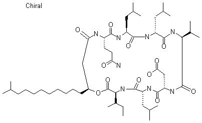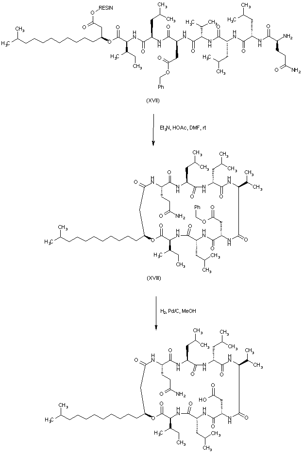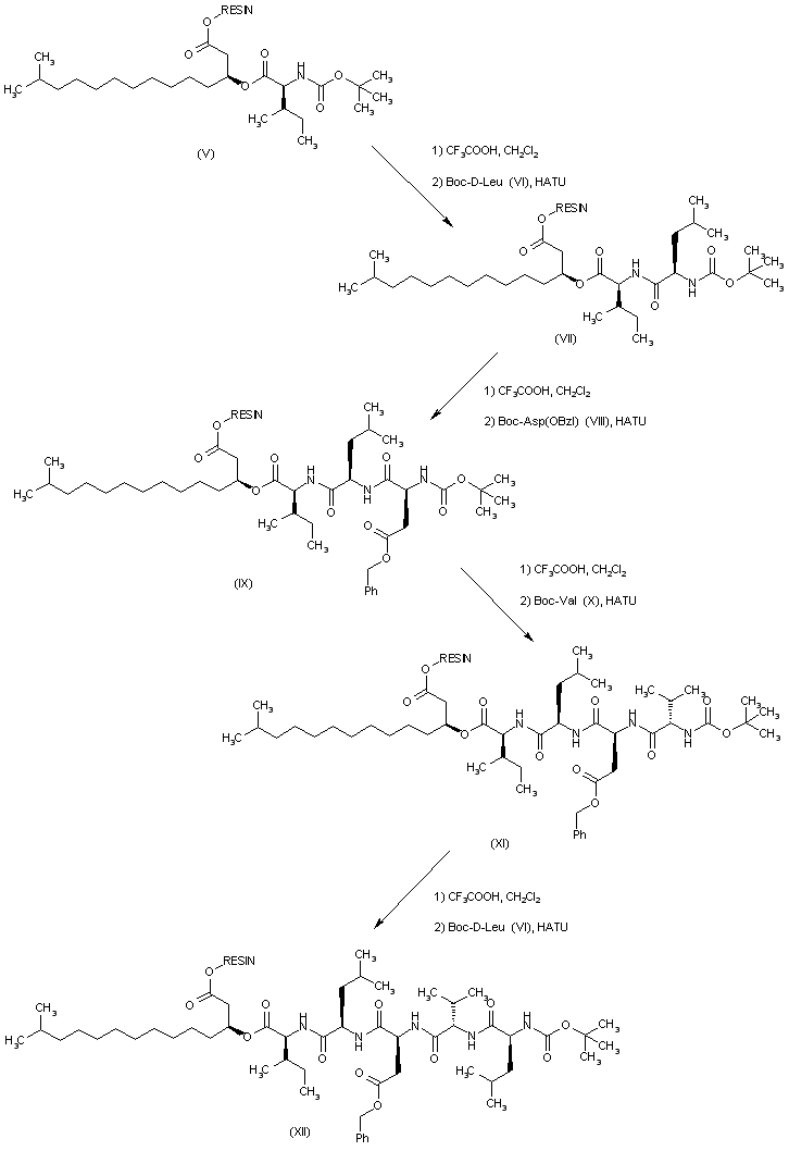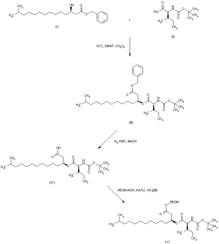 Condensation of (R)-benzyl 3-hydroxy-13-methyl tetradecanoate (I) with N-Boc-L-isoleucine (II) in the presence of dicyclohexyl carbodiimide and dimethylaminopyridine furnished the corresponding ester (III). After deprotection of the benzyl group of (III) by hydrogenation over Pd/C, the resulting carboxylic acid (IV) was attached to an oxime resin using O-(7-azabenzotriazol-1-yl)-1,1,3,3-tetramethyluronium hexafluorophosphate (HATU) to give the resin-coupled product (V).