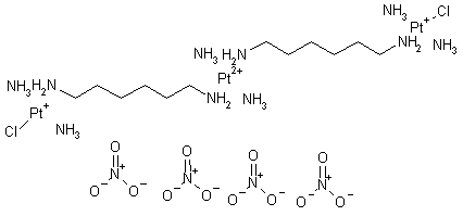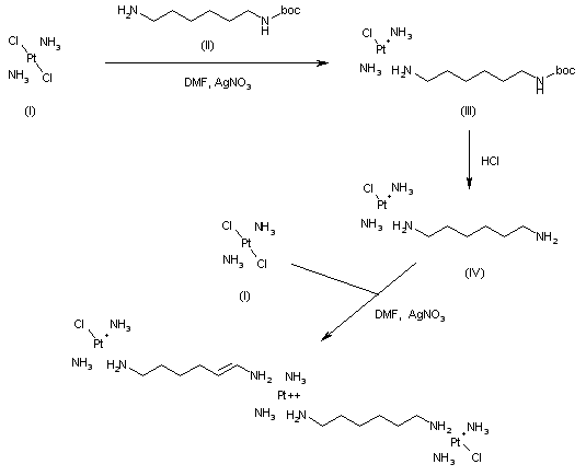 The condensation of platinum complex (I) with N-Boc-hexane-1,6-diamine (II) by means of 1 mole of AgNO3 in DMF gives the platinum complex (III), which is deprotected with HCl in methanol/ethanol to yield complex (IV). Finally, platinum complex (I) is condensed with two moles of complex (IV) by means of two moles of AgNO3 in DMF to afford the target trinuclear complex.