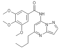 5-Butyl-7-hydroxypyrazolo[1,5-a]pyrimidine (III) was prepared by condensation of 3-aminopyrazole (I) with methyl 3-oxoheptanoate (II) in refluxing toluene. Treatment of (III) with POCl3 in the presence of Et3N furnished the 7-chloro derivative (IV), which was then heated with aqueous ammonia in a sealed tube to afford the amino pyrazolopyrimidine (V). Finally, acylation of amine (V) with 3,4,5-trimethoxybenzoyl chloride (VI) led to the title amide.