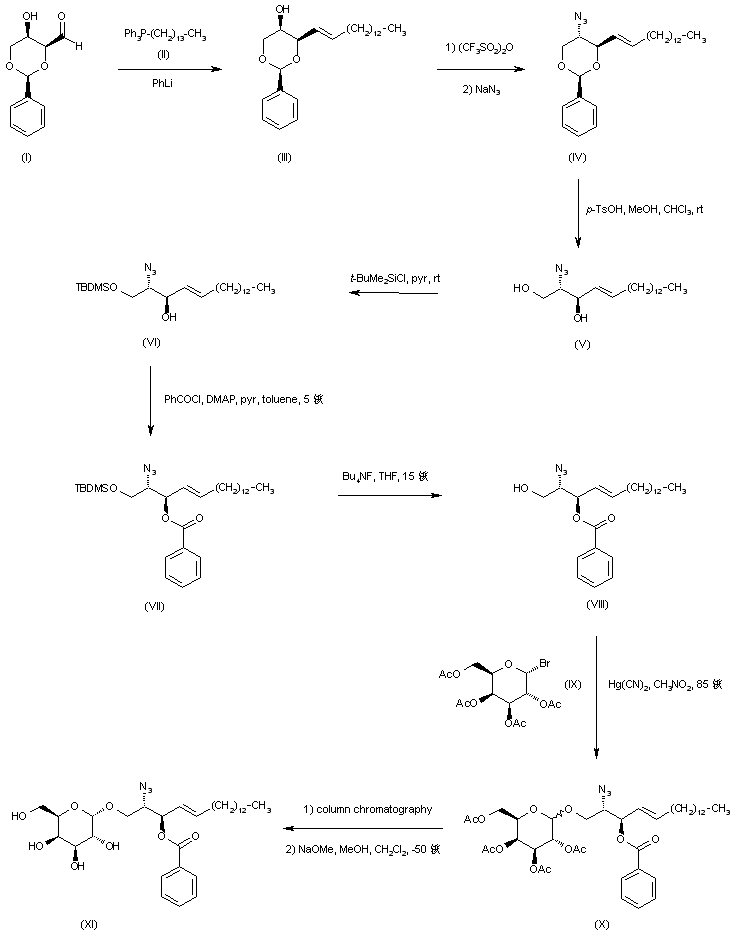 Wittig reaction of 2,4-O-benzylidene-D-threose (I) with the phosphorane derived from tetradecyl triphenyl phosphonium salt (II) provided the trans olefin (III). After conversion of hydroxyl group of (III) into the corresponding triflate, displacement with NaN3 yielded azide (IV) with inversion of configuration. Acid hydrolysis of the benzylidene acetal of (IV) gave diol (V). Then, selective protection of the primary hydroxyl group with tert-butyldimethylsilyl chloride produced silyl ether (VI). Subsequent benzoylation of the remaining hydroxyl group of (VI) gave benzoate ester (VII). The silyl protecting group of (VII) was then removed using tetra n-butylammonium fluoride in THF to give azido alcohol (VIII). This was coupled with tetraacetyl-D-galactosyl bromide (IX) to give the corresponding galactopyranoside (X) as an epimeric mixture. After chromatographic separation of the major beta-anomer, removal of the acetyl protecting groups with sodium methoxide yielded (XI).