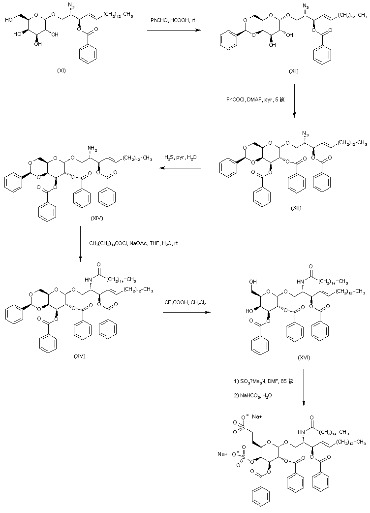 Protection of the 4- and 6-hydroxyl groups of (XI) was achieved by conversion into the benzylidene acetal (XII) upon treatment with benzaldehyde and formic acid. The remaining 2- and 3-hydroxyl groups of (XII) were benzoylated with benzoyl chloride to afford the corresponding benzoate ester (XIII). After reduction of the azide group of (XIII) to amine (XIV) with H2S and pyridine, condensation with hexadecanoyl chloride produced the corresponding amide (XV). Deprotection of the acetal group of (XV) with TFA in CH2Cl2 gave diol (XVI), which was finally treated with SO3-Me3N complex, and then with NaHCO3 to form the title disulfate sodium salt.