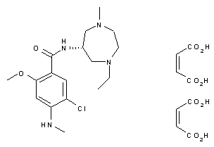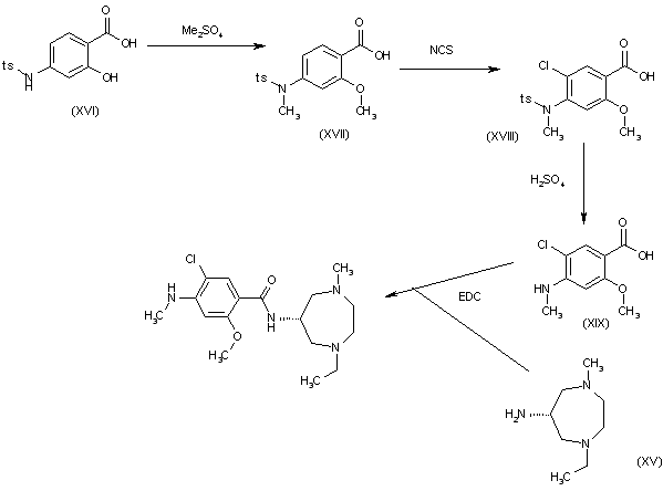 The methylation of 2-hydroxy-4-(4-methylphenylsulfonamido)benzoic acid (XVI) with dimethyl sulfate and KOH in refluxing acetone gives the N,O-dimethylated benzoic acid (XVII), which is chlorinated by means of NCS in hot DMF to yield the chlorobenzoic acid derivative (XVIII). The hydrolysis of (XVIII) with H2SO4 affords 5-chloro-3-methoxy-4-(methylamino)benzoic acid (XIX), which is finally condensed with the aminodiazepine (XV) by means of EDC in dichloromethane to obtain the target chiral benzamide derivative.